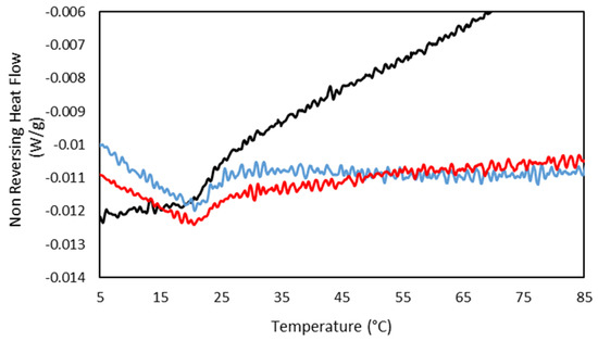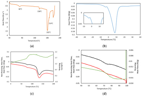 MDSC of Dry Tuna gelatin (Figure 9c,d as well as Figure S3) were also performed due to their higher sensitivity to confirm the presence of the glass transition at 68.9 °C (Table 7) that was evident in the reversing heat flow curve together with a water evaporation event and or enthalpic recovery due to the presence of an endothermic peak in the non-reversible thermogram (Figure 9d). Similar thermal behavior was also previously [58] observed in gelatin extracted from yellowfin tuna skin which was attributed to kinetic extensive structural rearrangements.