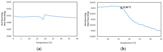 In addition, the MDSC Thermograms of the 25GE hydrogel proved the presence of the glass transition at ca. −65 °C for 25GE hydrogel (Table 7). The reduction in the glass transition temperature of the hydrogel in comparison with the dry Tuna gelatin is associated with the lubrication of gelatin by water molecules [58] due to its bridging action of the macromolecular network [58]. Furthermore, the MDSC of the 25GE hydrogel revealed the sol/gel transition in the ca. 17.8 °C to 25 °C temperature range (Figure 10).