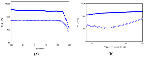 Strain and frequency sweep for Tuna gelatin hydrogel. Storage (G′; filled symbols) and loss moduli (G″; hollow symbols) depicted versus strain (a) and angular frequency (b) at 20 °C.