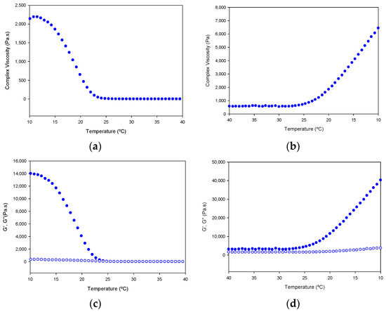 Variation of complex viscosity (a,b); and storage modulus (G′, filled circle) and loss modulus (G′′, empty circle) (c,d); with the temperature of Tuna gelatin hydrogel. Heating ramp (left column) from 10 to 40 °C, cooling ramp (right column) from 40 to 10.