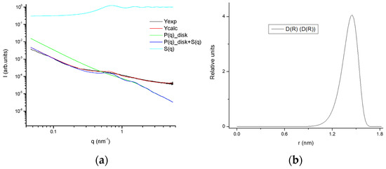 The experimental SAXS data were fitted by an in-house program [67,68] that uses the minimization MINUIT program created by CERN [67,68]. The measured SAXS profile intensity (I(q)) were adjusted to an interacting disk-like shape model [69] described by a structure factor of hard-disk mixtures resolved by an analytic theory resulting from a free-energy functional for the inhomogeneous hard-disk fluid [70]. The pores observed by cryo-SEM suggested a random uniform distribution that was previously modelled [71] with the hard-disk structure factor (Equations (2) and (3)) [63] to consider the scattering interference aroused from the different pores by interpolating the analytical solution of a two-dimensional mixture of inhomogeneous discs from the analytical cases of one and three dimensions and with the structure factor defined as:
