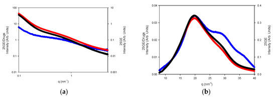 (a) WAXS and (b) SAXS of Dry GE (Orange line) and 25GE (blue line) at 5 °C·min−1 at 25 °C.