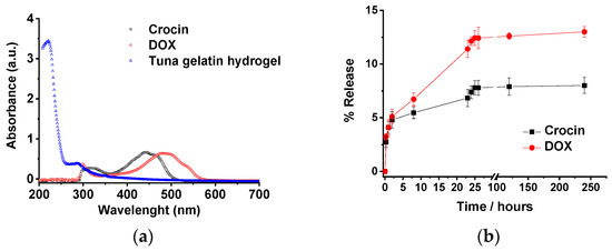 Likewise, the development of tuna skin gelatin hydrogels has the potential to design carrier vehicles for antitumoral therapeutic agents for local administration in complex anatomical areas after cancer resection [13] to minimize harmful side effects in healthy cell tissues as high doses of antitumoral are required to be systemically administered to exert any therapeutic benefit [14]. The loading/releasing capacity of the tuna gelatin hydrogels was assessed with two structural different antitumoral compounds, Doxorubicin (DOX) and Crocin (Figure 1), to understand the role of the intermolecular interactions.