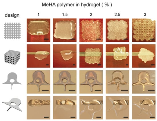 - Poldervaart, M.; Goversen, B.; de Ruijter, M.; Abbadessa, A.; Melchels, F.; Öner, F.; Dhert, W.; Vermonden, T.; Alblas, J. 3D Bioprinting of Methacrylated Hyaluronic Acid (MeHA) Hydrogel with Intrinsic Osteogenicity. Public Libr. Sci. One 2017, 12, e0177628. [Google Scholar] [CrossRef] [Green Version]