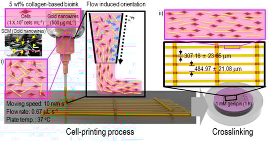 - Kim, W.; Jang, C.; Kim, G. A Myoblast-Laden Collagen Bioink with Fully Aligned Au Nanowires for Muscle-Tissue Regeneration. Nano Lett. 2019, 19, 8612–8620. [Google Scholar] [CrossRef] [PubMed]