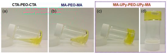 The gestation test of supramolecular hydrogel: (a,b) the solution of CTA-PEO-CTA and MA-PEO-MA is at a sol state at room temperature, while the solution of MA-UPy-PEO-UPy-MA can form a stable hydrogel (c,d).