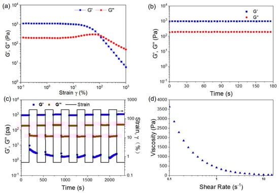 Rheological characterization of obtained hydrogel: (a) strain-sweep measurements; (b) an immediate recovery after the 1000% strain deformation; (c) dynamic strain amplitude cyclic test (γ = 0.5% or 300%); (d) viscosity measurement.