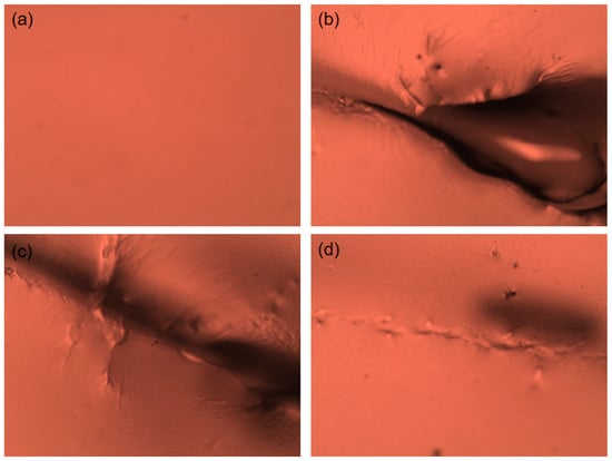 Optical microscope images of the self-healing process of supramolecular hydrogel: (a) initial hydrogel; (b) damaged hydrogel; (c) after healing 0.5 h; (d) after 5 h healing.