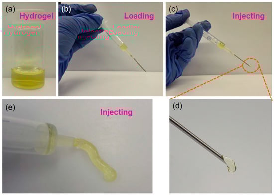 As supramolecular hydrogels are self-healing soft materials that hold great promise in biomedical engineering applications, especially for minimally invasive surgery, their injecting ability is vital and significant [,,]. We then characterized the injecting behavior of the prepared MA-UPy-PEO-UPy-MA hydrogel with a syringe equipped with a small-gauged needle (24 gauge). As clearly depicted in Figure 6a, the prepared supramolecular polymer solution was in a gelation state at room temperature and could be facially loaded into the plastic syringe at 60 ℃ because high temperature can destroy hydrogen bonding and the hydrophobic interactions, causing the hydrogel to transform to a sol state (Figure 6b). When applying a relatively small force, the hydrogel could be injected out from a small-gauged needle (Figure 6c,d), suggesting the excellent injecting capability of the MA-UPy-PEO-UPy-MA hydrogel. After injecting from the syringe, the hydrogel kept the cylindrical shape without any change (Figure 6e), indicating the superior mechanical performance of the supramolecular hydrogel.