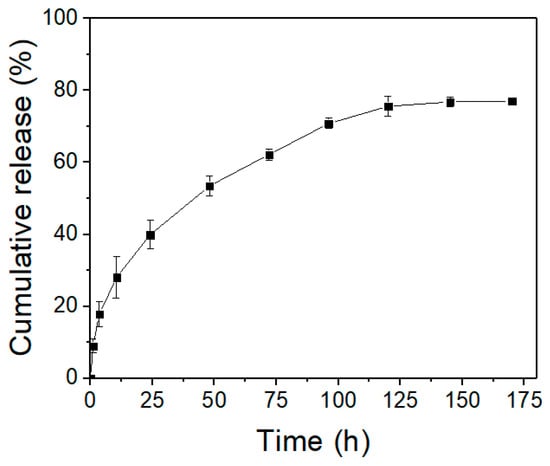 It is well known that hydrogels are one of the most promising soft materials used as drug carriers in biomedical engineering applications [,,]. Therefore, the bovine serum albumin (BSA), an important water-soluble protein usually used in biochemical research, was utilized as a target drug for the in vitro drug release test of the as-prepared MAUPy-PEO-UPy-MA supramolecular hydrogel, while the whole release process was detected using UV–Visible absorption spectra. As is shown in Figure 7, the release rate of BSA was relatively fast during the initial 100 h (corresponds to 4 days), and the release amount reached a value of about 75 wt% after another 4 days. The relatively fast release during the initial four days is classic behavior of Fick diffusion, which is probably ascribed to the BSA concentration difference between water and hydrogel network. After the initial fast diffusion, the release rate of the BSA dramatically decreased and stepped into a sustained release state. After the initial 125 h, the in vitro release reached a maximum value of 87 wt%, and the curve shows almost no apparent fluctuation anymore, suggesting that almost all protein was released from the hydrogel and about 13 wt% of target drugs were left in the hydrogel network. Along with its outstanding self-healing capacity and possible potential for injection manipulation, the prepared UPy-PEO-UPy-MA supramolecular hydrogel provided an intriguing glimpse into the application of drug release.