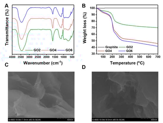 (A) Fourier-transform infrared (FTIR) spectra and (B) Thermogravimetric analysis of GO2 (red line), GO4 (blue line), GO6 (black line) and graphite (square dotted line); (C,D) Scanning electron microscopic (SEM) images of GO6 dispersed in deionized water solution.