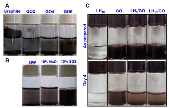 Figure 2C affirms the interaction of LH and GO by means of ionic complexation. It is clear that the LH10 solution remains apparent throughout the experiment. As just mentioned, the GO (LH0/GO) solution still reveals the well-dispersed property by day 4. Meanwhile, the LH-containing solutions (LH5/GO, LH10/GO) are less turbid than LH-free solution (LH0/GO) and show a significant aggregation on day 4. The phenomenon showed that there was a surface charge transition of GO from very negative to neutral. The neutralization, which mostly causes by the complexation between the basic group of LH and the acidic carboxyl of GO, induces GO plates to cluster together into a mass and conglomerate at the bottom.