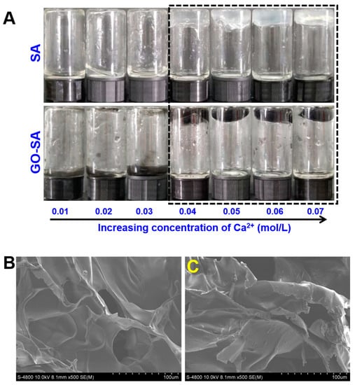(A) Macroscopic images of hydrogel development. The experiment was conducted with blank SA hydrogel and GO-SA hydrogel. Both hydrogel systems commenced forming hydrogel at the feeding concentration of crosslinker of 0.04 mol/L, which zoning within a dotted area. SEM images of (B) SA and (C) GO-SA hydrogels.
