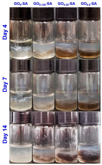 By observing the macroscopic morphology of hydrogel samples in PBS medium (Figure 4), it is recognized that the GO0/SA present rapid swelling at the interfacial surface. After 2 weeks, the hydrogel mostly decayed into an opaque liquid which contains decomposed SA polymer chains. This quick decay might be contributed by the ion exchange between divalent ions (Ca2+) in calcium alginate and monovalent ions existing in PBS solution []. For GO-SA hydrogels, there is a more stable tendency in the aqueous medium. Indeed, the higher concentration of GO boosts the synergetic effects of GO on the reinforcement of hydrogel, thereby lessening the degradation of the hydrogel systems under fluid condition [,].