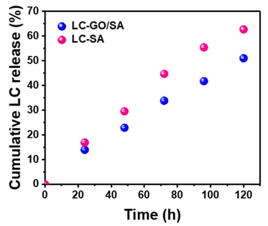 SA and GO-SA hydrogels were used to encapsulate the model anesthetic (LH), in which the soluble form of lidocaine, lidocaine hydrochloride, was released in PBS medium with time. The behavior of release profiles, which illustrates in Figure 5, is considered to be relatively linear and stable without burst release. The higher slope in the release of SA hydrogel reveals the faster drug release rate compared with that of GO-SA hydrogel. After 120 h, 62.73 ± 0.70% encapsulated drug had diffused out of SA hydrogel network into external medium, whereas there was only 51.10 ± 0.44% LH had been released from GO-SA hydrogel. It is persuasive that our facile design of graphene oxide-incorporated polymeric hydrogel is efficient to delivery and control sustaining release of lidocaine for local anesthesia.
