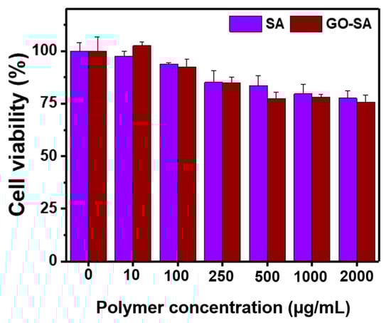 Non-toxic property of hydrogels or hydrogelators is an essential factor for biomaterials in in vivo applications. In order to prove biocompatibility of hydrogels, various concentrations of SA or GO-SA hydrogels were co-incubated with L929 mouse fibroblast cells for 48 h followed by evaluating the viability using MTT assay. The cell viability of L929 mouse fibroblast cells co-cultured with hydrogels is shown in Figure 6. As expected, cell viability of fibroblast cells was high (>80%) even they were exposed with 2000 µg/mL of hydrogel precursors, which implied the biocompatibility of GO-SA hydrogels.