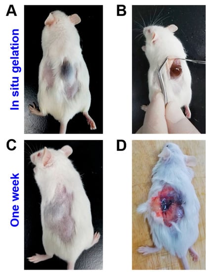 Photographs of the in vivo study: (A) Grey bumps of GO-SA hydrogel cured under the mice’s skin after hypodermic injection, (B) Incision to test stable gel formation of the hydrogel. (C) After a week, the hydrogel remained stable without inflammation and (D) After 1 week, disintegration of the GO-SA hydrogels was observed. This is mainly due to the slow exchange of cations and salt effects.