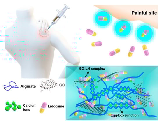 In order to improve the stability and control degradation of hydrogel network system, graphene oxide (GO) was introduced to the hydrogel network []. Apart from graphite, GO is a mono-layer and oxidized derivate of it, which is overexpressed with plentiful oxygen-enriched functionalities on graphene-based planar sheets, thus making it have high solubility in water as well as organic solvents [,]. Furthermore, the oxygenated groups, especially hydroxyls and carboxylic acids, can further formulate the ionic complexes with the basic groups of lidocaine hydrochloride (LH) [,]. Altogether, GO was considered as the best promising combination for any conventional hydrogel system.
