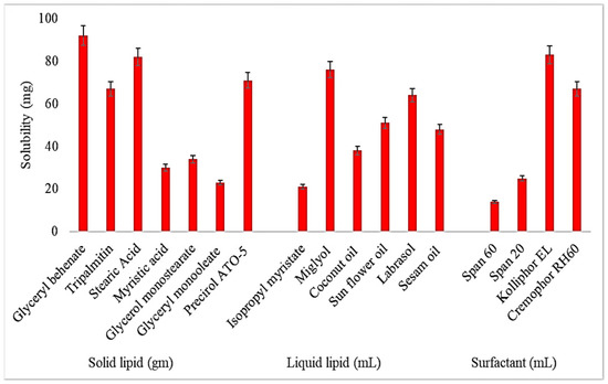 Solubility profile of Azithromycin in different lipids (solid and liquid) and surfactants. Study performed in triplicate and results shown as mean ± SD.