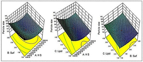 The above equation states that homogenization speed (A, coefficient −50.27) and surfactant (B, coefficient −21.80) showed a negative effect. On the other hand, the third variable, lipid concentration (C, coefficient +30.48), depicted a positive effect. The quadratic coefficient of A2, B2, and C2 showed the positive values of +62.24, 27.99, and +3.94, respectively. The interpretation explains that the variables alone and in combination had a positive effect on the particle size. Based on insignificant lack of fit (F = 0.61, P = 0.6419) and the lowest precision (313.33) value, the quadratic model was chosen as the best fitting model to describe the influence of independent variables on particle size.