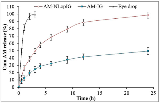 Figure 6 depicts the comparative release profile of AM-NLopIG, AM-IG, and eye drop using the dialysis bag method. The release of AM from AM-NLopIG and AM-IG was found to be 98.65 ± 4.65% and 49.48 ± 4.23%, respectively, in 24 h. The eye drop depicted 99.45 ± 5.3% release in 3 h. AM-NLopIG exhibited biphasic release behavior, with initial fast release and later slow release. The initial fast release may be due to the nano-sized particles of NLs and a higher effective surface area. The drug particles adsorbed on the surface of NLs enter the dissolution media. Later, the slower drug release was found to be due to the formation of gel matrix, and the drug needs to cross it as well as the dialysis membrane. The eye drop showed quicker release in 3 h due to the lesser viscosity, and the drug is available for release. AM-IG showed significantly less release than AM-NLopIG due to the poor solubility and non-availability of surfactants. The surfactant helps to increase the solubility and lowers the interfacial tension between the two phases.