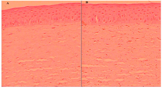The cornea was collected after the permeation study and assessed for internal damage in the structure. The histopathology of the treated cornea with AM-NLopIG and control (NaCl, 0.9%) was compared to changes in the structure, as depicted in Figure 7A,B. AM-NLopIG-treated cornea revealed no marked change in the internal structure. No damage in cellular structure or histological alterations were observed in the treated cornea, matching with the normal saline-treated cornea. The epithelium, Bowman’s membrane, and stroma of the cornea and the cells were found intact, similar to the control sample. The morphology of the cornea was also well maintained [38]. From the results, we can presume that there is no alteration in the corneal structure, and that AM-NLopIG is nontoxic and compatible with the ocular structure.