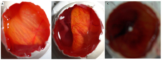 HET-CAM irritation test image treated with AM-NLopIG (A), 0.9% NaCl (B), and 1% SLS (C).