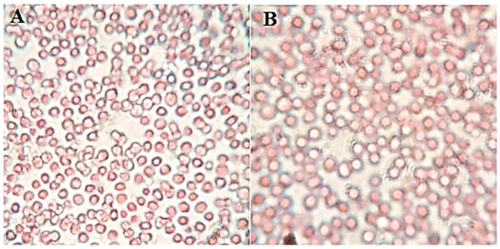 The study was performed to evaluate the damage to the blood cells after treatment with AM-NLopIG. It was evaluated by treating with goat blood and observed under a microscope for any damage to RBCs. AM-NLopIG- and control (0.9% NaCl)-treated blood samples were evaluated for shrinkage and swelling to the blood cells and did not show any damage in RBC, revealing that the formulation is isotonic (Figure 9A,B). The results of the study are supported by the findings of the HET-CAM results. It also revealed no damage to the CAM.