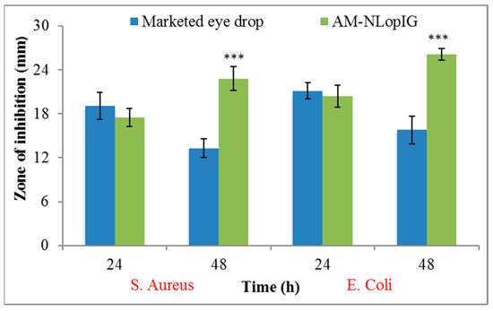 Antimicrobial graph of AM-NLopIG and eye drop evaluated against S. aureus and E. coli. Results shown as mean ± SD. *** indicates significant difference to the marketed eye drop.