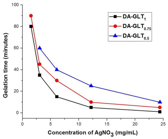 Gelation time of different DA-GLT at different contents of DA-GLT (the weight ratio of DA-GLT to AgNO3 in feed is fixed at 50:11).
