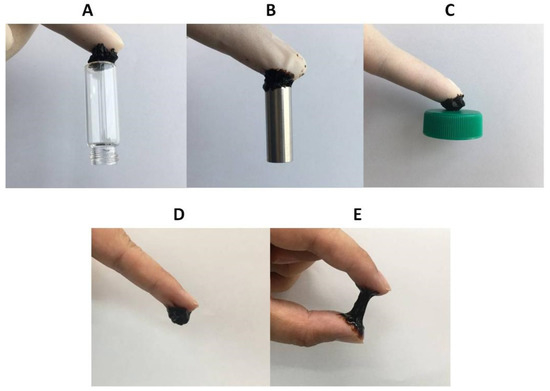 Adhesion of DA-GLT/AgNPs composite hydrogels to (A) glass, (B) metal, (C) plastic, and (D,E) skin.