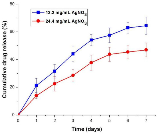 The composite hydrogels were tested as depots for the sustained release of therapeutic agents. Figure 6 shows the time-dependent cumulative release of DOX from the composite hydrogels with different feeding concentrations of AgNO3. DOX (in its salt form) is a widely used, water-soluble drug in cancer treatments. As shown in Figure 6, DOX can be released from both composite hydrogels in a sustained manner without any initial burst release. This might be attributed to the fact that electrostatic interactions between anionic gelatin and cationic DOX restrict free movement of the DOX molecules. Furthermore, the release rate of DOX from the composite hydrogel with higher feeding concentration of AgNO3 is slightly slower than that from the composite hydrogel with a lower feeding concentration of AgNO3, which might be attributable to the lower swelling ratio of the composite hydrogel with a higher feeding concentration of AgNO3. This result suggests that these composite hydrogels are good candidates for controlled drug release depots.