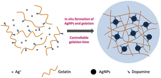 AgNPs-crosslinked gelatin hydrogels are prepared in a simple one-step procedure through fast and simultaneous AgNPs formation and crosslinking. A previous study reported that dopamine can reduce Ag+ in aqueous solutions, leading to the formation of AgNPs [19]. It is believed that the hydroxyl groups of dopamine can rapidly reduce Ag+ in aqueous solutions. In this procedure, the dihydroxy molecules of dopamine lose two electrons, leading to the generation of a quinone molecule, and the quinone molecules are subsequently adsorbed on the surface of the formed AgNPs. For the formation of AgNPs in this work, we used gelatin with pendent dopamine groups (Scheme 1). Since there are many pendent dopamine groups in one molecular chain of gelatin, gelatin can connect different AgNPs. We can control the gelation and gelation time by controlling the concentration of DA-GLT, conjugation density of dopamine, and weight ratio of DA-GLT to AgNO3.
