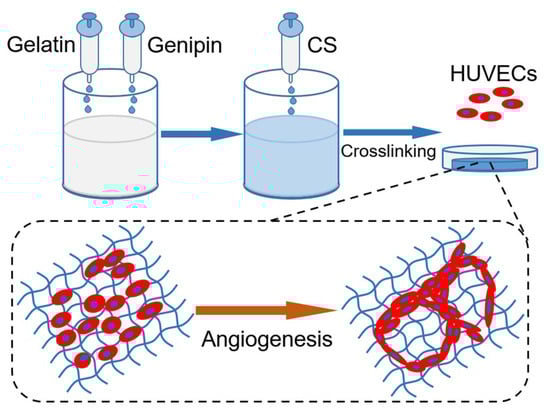 Inspired by their conclusions, gelatin-based hydrogels with CS release properties are also proposed here, and are assumed to regulate the angiogenesis behaviors of ECs via various CS loading amounts. Different from the report by Xiong et al. [19], herein, gelatin hydrogel was chemically cross-linked by genipin during preparation, with the aim of maintaining its mechanical stability, prolonging the release period of CS, and the effective stimulation of ECs. Accordingly, the objective of this work was to develop a hydrogel platform with visible modulation on the angiogenesis behaviors of ECs (shown in Figure 1). Therefore, composite hydrogels containing various CS concentrations were manufactured and characterized on physical and biological tests.
