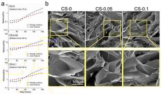 The gelation behavior of different hydrogels was investigated, and the results are shown in Figure 2a. After 75 s at room temperature, gelatin began to gel due to the construction of hydrogen bonds within the molecular chains. Meanwhile, the gelation time increased to 84 s after CS addition, which might be ascribed to the charge repulsion between gelatin and CS molecules.