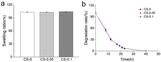 In general, gelatin-based hydrogels show high swelling properties and inferior resistance to body fluids. In a previous study by Entekhabi et al., gelatin hydrogel was reported to have a swelling ratio of 500% at the same concentration as our study [21]. Thus, a genipin crosslinker was employed here. In Figure 3a, hydrogels present swelling ratios of 103.10 ± 0.54%, 102.83 ± 0.76%, and 104.13 ± 0.35% in the CS-0, CS-0.05 and CS-0.1 groups, respectively, indicating the development of stability after crosslinking. Due to the collagenase enzymolysis, hydrogels of three groups can biodegrade within 40 h, as can be seen from Figure 3b. However, no obvious distinction can be found among the groups, meaning that the Hofmeister effect did not affect the swelling ratios and biodegradability of the hydrogels.