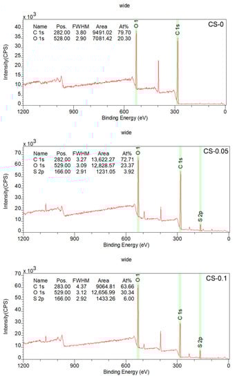 The elemental spectra of the CS-0, CS-0.05, and CS-0.1 hydrogels were identified by XPS, and the results are displayed in Figure 4. As expected, S 2p photoelectron signals were only detected in the CS-0.05 and CS-0.1 groups. The atomic compositions of these samples were calculated on the basis of the XPS spectra, and are shown as inserts in Figure 4. According to the data, the elemental ratio of sulfur was 3.92 at% in the CS-0.05 sample, while it was 6.00 at% in the CS-0.1 group, nearly two-fold the value of the CS-0.05 sample. These results prove that CS was successfully introduced into the composite hydrogels.