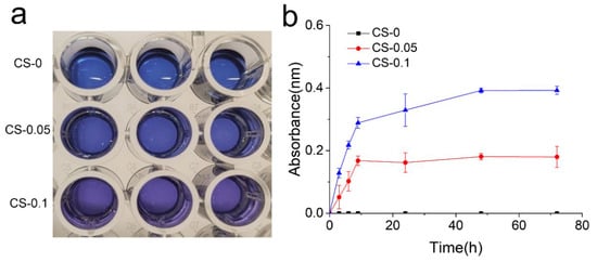 The release properties of CS from the hydrogels was quantified using the Azure A staining method. Azure A is a cationic dye, and a discoloration effect can occur through electrostatic interaction between Azure A and sulfate radicals in CS [22]. Therefore, the hydrogel extract, which is the initial blue color in the CS-0 group, changes to a bluish-purple color when Azure A is added to the CS-0.05 and CS-1 groups (Figure 5a). The release profiles of CS were determined, and are in Figure 5b. The profiles of the CS-0.05 and CS-1 groups are stable and linear during the first 10 h. The CS-0.1 group shows a higher release rate than CS-0.05, which ascribes to more loading amount of CS. The CS-0.05 hydrogel reaches an equilibrium state after 10 h. While in CS-0.1 group, the equilibrium state occurred after 48 h. The distinction may be attributed to electrostatic interactions between gelatin and CS. The data above also approve that the release behavior can be tuned through different CS loading.
