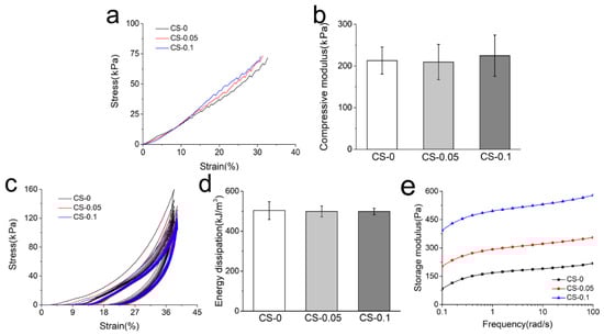 The mechanical properties of hydrogels were studied using a universal testing machine, and the compressive stress–strain curves and corresponding moduli of different hydrogels are presented in Figure 6a,b. As can be observed, the compressive moduli of hydrogels are around 210 kPa, which is obviously higher than that presented by the pure gelatin hydrogel in our last report [23], indicating that the combination of genipin and CS can improve the mechanical properties of gelatin hydrogels. However, with 0.1% CS addition, the compressive modulus of CS-0.1 hydrogel only increased by tens of kPa compared to that of CS-0, meaning that the crosslinking effect is the main cause of the enhanced mechanical properties.