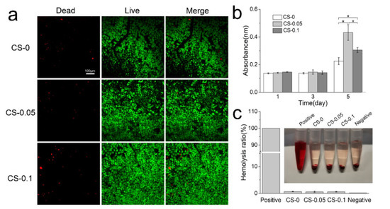 Cytocompatibility and hemocompatibility are essential criteria of hydrogels for biomedical applications. Herein, the cytocompatibility of hydrogels was evaluated via live and dead cell staining and CCK-8 proliferation assays. First, HUVECs were cultured on the surface of hydrogels for 4 days, then stained with a live and dead activity kit. Figure 7 shows the staining images under a confocal microscope. Cells in the CS-0.05 and CS-0.1 groups can adhere to the hydrogel surface and present a spindle-like morphology, which is consistent with that of the CS-0 group. Though few dead cells (labeled by the red color) can be found, the surviving rates in all groups exceed 95%. Notably, the coverage area of cells in the other two groups is larger than that of the CS-0 group, suggesting that CS addition can enhance the proliferation of HUVECs. To validate this conclusion, cell numbers from each group were measured after 1, 3 and 5 days via the CCK-8 kit, and the results are presented in Figure 7b. CS addition dramatically promotes the proliferation rate of HUVECs, leading to higher absorbance values than in the CS-0 group after 5 days. However, CS-0.05 presents the highest absorbance value, which may be ascribed to the competition among excess cells.