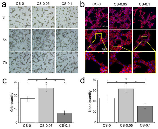 As a component of ECM, CS has been recognized to play multiple roles in regulating numerous cell activities [26]. To study the angiogenesis regulation of hydrogels on HUVECs, cells were photographed at different time points to observe dynamic changes during the sprouting assays. From Figure 8a, HUVECs are loose, without connections at the beginning of culture. After 5 h of culture, cells began to form networks with an elongated morphology, and the CS-0.05 group presents the most numerous and most dense networks. After 7 h, the tubular structures in all groups start to collapse and disappear. We further stained the cytoskeleton and nucleus at the 5 h time point, and observed cell morphology under laser confocal microscopy. Denser tubular structures and more elongated actin filaments were found in CS-0.05 group than in the other two groups. Meanwhile, in the CS-0.1 group, the angiogenesis ability of HUVECs was inhibited, with spherical and unstretched morphology at the junctions. The numbers of grids and nodes in the tubular structures shown in Figure 8b were counted via Image J software [27], and the results are presented in Figure 8c,d. As can be seen, the CS-0.05 group has the largest numbers of grids and nodes, and the CS-0.1 hydrogel has fewer grids and nodes than the CS-0 group, suggesting that a low concentration of CS might be more suitable for promoting angiogenesis and subsequent tissue regeneration.