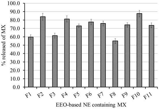 Studying the in vitro release of MX from the developed EEO-based NEs was effectively employed, and the outline of the release is portrayed in Figure 2. As shown in the figure, the percentage of MX released from the preparations following 6 h ranged between 55.0 ± 2.8% and 87.6 ± 3.9%. It is apparent that upon increasing the oil concentration in the preparation, it showed a decrease in the percentage of MX released from the NE. This could be attributed to the fact that a higher oil concentration would provide the NE with a greater particle size, which would offer a smaller surface area and, consequently, a lower percentage of drug released [37]. Conversely, it was distinguished that while using same concentration of oil, increasing the surfactant concentration would result in ameliorating the release of the drug from the NE, owing to enhancing the solubility of the drug in the aqueous media [38].