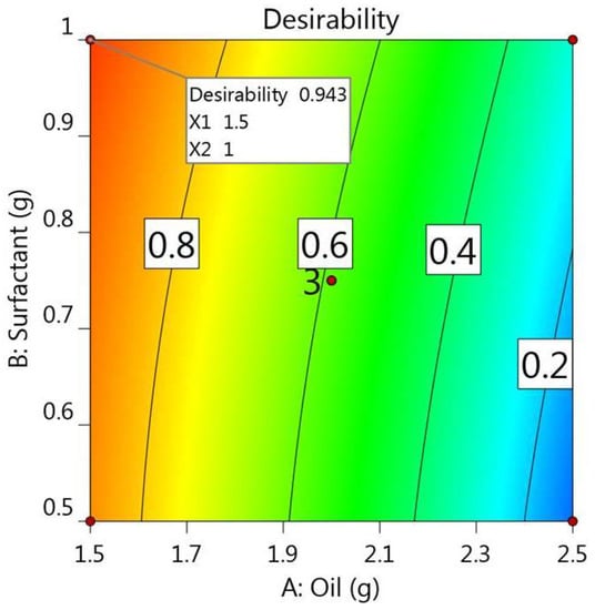 Desirability figure displaying the effect of the oil concentration and surfactant concentration on the overall responses.