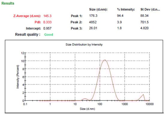 A new NE formulation was generated, depending on the predicted values of the CCD examinations, followed by further investigations. Figure 5 illustrates the particle size of the optimized MX-NE formulation.