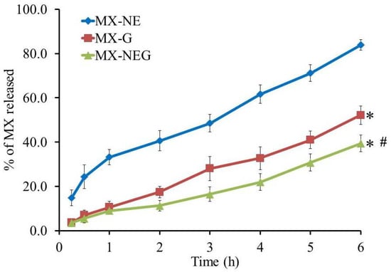 In vitro release of MX from the MX-NE, MX-G and MX-NEG formulation in a phosphate buffer with pH 7.4 at 37 °C. The results are expressed in respect to the mean ± SD of the three experiments. * p < 0.05 compared to the MX-NE formulation; # p < 0.05 compared to the MX-G formulation.