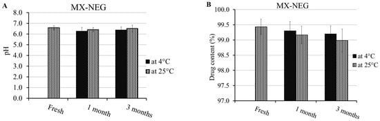 Investigating the stability of the MX-NEG formulation was accomplished, and the data are exhibited in Figure 7A–E. The results were assessed over a period of 1 and 3 months and compared to a fresh NEG preparation. Non-significant variations were perceived in terms of the formulation’s character (pH, % of drug content, viscosity, spreadability) and the percentage of MX’s in vitro release from the stored formulation, which certified an excellent stability profile of the formulation and ensured its proficiency as a nanocarrier (p < 0.5).