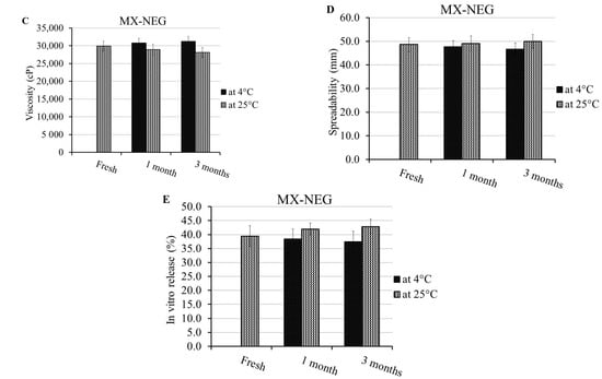 Stability profile of the MX-NEG formulation following 1 and 3 months at 4 °C and 25 °C in terms of (A) pH, (B) % of drug content, (C) viscosity, (D) spreadability and (E) % of in vitro drug release compared to a freshly prepared formulation.