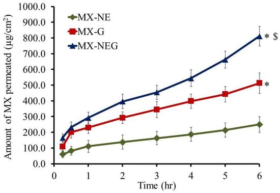 Permeation study of MX from different formulations across animal skin. Results are expressed as the mean ± SD (n = 3). * p < 0.05 compared to MX-NE; $ p < 0.05 compared to the MX-G formulation.