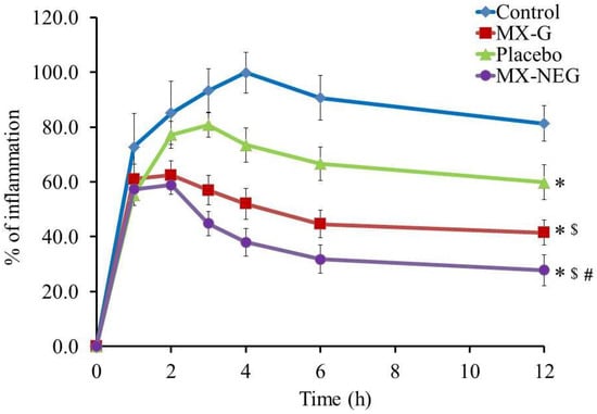 Representing the anti-inflammatory effects of various formulations on a rat hind-paw edema. Results are expressed as the mean with the bar showing the SD (n = 6). * p < 0.05 versus the control treated group; $ p < 0.05 versus the placebo treated group; # p < 0.05 versus the MX-G-treated group.