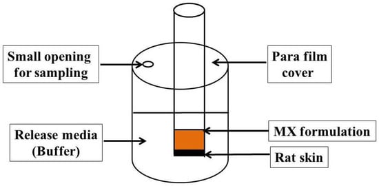 Adapted Franz diffusion cells established in our lab were employed to detect the permeation of MX from the gel and NEG through the skin of male Wister rats, as illustrated in Figure 10 [55,56,57]. The diffusion system was kept at 37 ± 0.5 °C and contained 100 mL of phosphate buffer (pH 7.4) with 0.02% sodium azide. Glass tubes were suspended in the media in the apparatus. The rat skin was attached to the diffusion cell, wherein the upside of the skin faced the formulation, while its dermis was in front of the receptor media. The examined formulation was enclosed with the rat skin membrane and fixed to the glass tubes. In order to evade evaporation of water, the cells were covered with Parafilm (Bemis, Oshkosh, WI, USA), and the system was stirred at 100 rpm. [58]. The steady state transdermal flux (SSTF) and enhancement ratio (ER) are two parameters relating to the ex vivo permeation study that were evaluated, since SSTF represents the amount of permeated drug/(area × time); whereas ER denotes SSTF from the test/SSTF from the control.